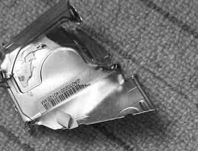 笔记本电脑硬盘外壳只是一层很薄的铁片,很容易弯曲变形,而台式机硬盘采用很厚的金属材质制作而成,不容易变形。之所以采用很薄的材质制作硬盘,是为了让笔记本电脑硬盘做得更轻,所以在硬盘使用过程中不要用力按或者在表面放重物,这样会使磁头过于接近盘片而导致盘片划伤的。图6为变形的硬盘,外层金属很薄。