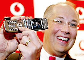 日本伏得风(Vodafone)总裁格林展示一部内置电视选台器的第三代手机。