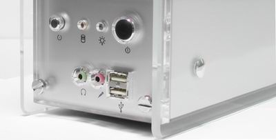 打开隐藏式前置扩展仓,里面是光纤输入、前置音频、两个USB 2.0、两个火线接口再在5.25寸预留槽处,安装一部六合一的读卡器。日常应用中,一般情况下根本就不需要使用后面接口了。