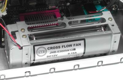 看了这么薄的一款机箱,有人一定担心它的散热。QDI巧妙地解决了散热难题,它使用了类似家用空调式的滚筒式散热风扇。学过流体力学的朋友们应该知道,直吹式风扇会造成中心的“风力盲区”,而侧吹式则不会有。这样可以最有效的将机箱内的热量导出,保持系统稳定运作。