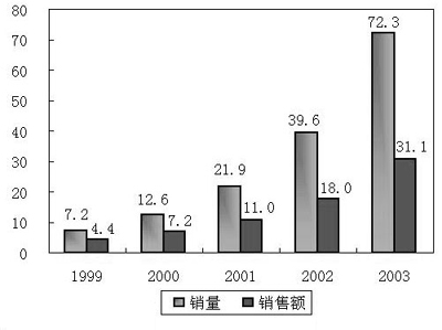 图1 近几年中国数码相机市场发展状况 资料提供:CCW Research 2003.06