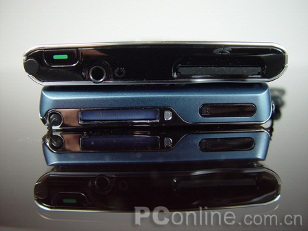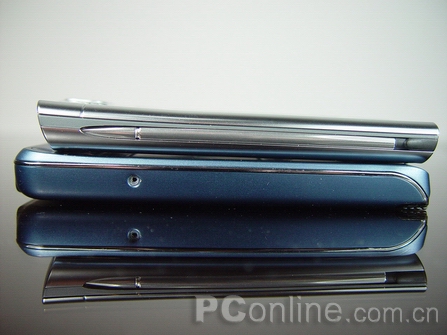 TE的体积是114x78.7x12.8mm,厚度只有12.8mm。CLIE T600C的体积是118.0×71.8×12.5mm,厚度是12.5mm。两机的厚度已经是非常接近。从侧面可以看到TE是弧形设计的,最薄处和CLIE T600C旗鼓相当。