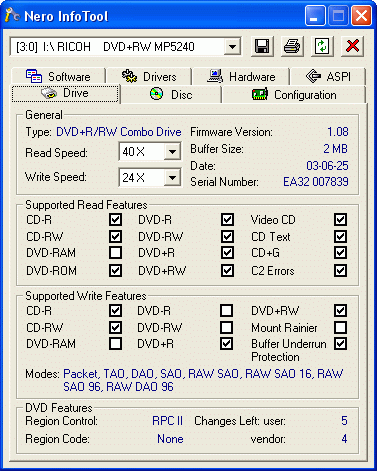 理光的产品早在CD刻录机时代就已经以出色的品质和优秀的产品质量所闻名,到了DVD刻录时代,相信理光的产品仍然能够以优异的质量赢得用户的欢迎,这款MP5240A和BenQ的产品一样,也是仅仅支持DVD+R/RW的一款产品,虽然这款机器的DVD+R刻录速度不能达到8x的标准,但是其DVD+RW的复写能力确实能够达到4x的高水平。