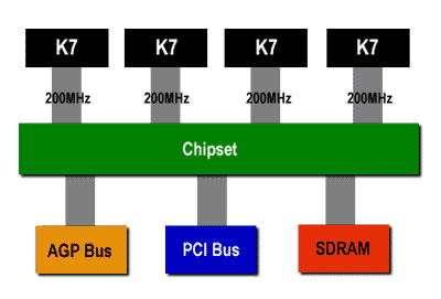 这方面的例子有AMD的上一代K7架构,如上图。它采用同为点对点传输的EV6前端总线技术,前端总线数据传输率数据传输率为总线运行频率的2倍,即200×2=400MHz。不过,虽然在处理器与北桥芯片之间使用点对点传输,然而多处理仍然必须共享集成在北桥里的内存控制器。