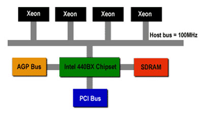 Intel P4 3.2GHz则仍使用沿袭自P6架构的多处理器共享式AGTL+前端总线技术,如上图。不过,Intel将前端总线数据传输率提升为总线运行频率的4倍,即200×4=800MHz。多处理器间不仅共享前端总线,同时还必须共享集成在北桥里的内存控制器。