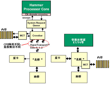 因此,新的K8核心处理器使用了全新的北桥架构,把旧有北桥一分为二,将传统北桥的内存控制器和北桥总线接口内置到CPU核心中,而传统北桥中的AGP控制器以及同南桥进行数据交换的接口界面则仍然外置。新的北桥架构通过外置Hypertransport总线将北桥的内置部分同外置部分的AGP控制器等连接在一起。下面,我们给出传统系统结构与K8结构的区别图如下: