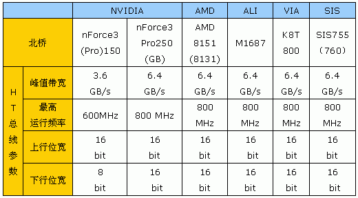 为此,我们列出根据官方声明更正后的各大厂家生产的K8平台北桥芯片组的HyperTransport接口特性,如下表: