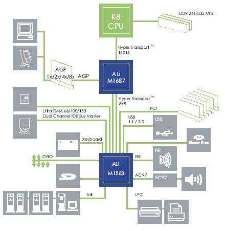 如此多的厂家都提供了自己的K8平台解决方案,ALI公司当然也不甘落后,他们也推出了M1687+M1563的K8平台。以下为M1687+M1563的系统构架图: