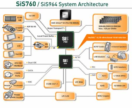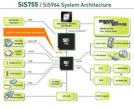 台湾的另一家芯片组大厂SiS则推出了SiS755和SIS760领衔的两款芯片组为K8助阵。以下是这两套组合的系统结构图: