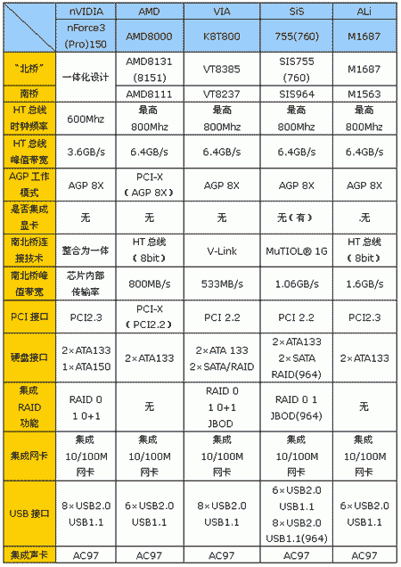 从上面的芯片组介绍,大家可以体会到如此多支持K8的芯片组厂商都纷纷推出了自己的K8平台芯片组,真可谓是乱花渐欲迷人眼。为此我们特别整理了如下的表格,以供大家参考对比。考虑到我们在上面已经贴出了nForce3芯片组的较全面表格,因此在上面的表格中我们只选取主流桌面市场上大家比较感兴趣的nForce3 Pro 150来做对比。