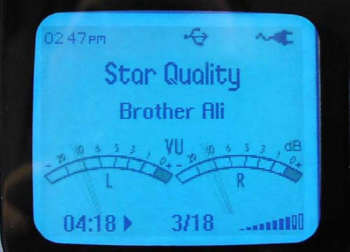 Karma另一个有特色的地方是它的液晶显示,居然搞搞新花样,搞出个VU电平表的效果,据我所知,像这类表是用来测量左右声道相位差,如今居然出现在这般大众化的随身听身上,真让人有些不解。