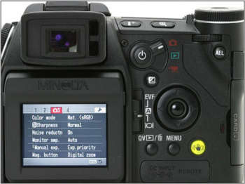 在取景器方面,F717和A1都是使用电子取景器。不过从技术上以及实用性来说,美能达A1就具有绝对的优势了。首先它的电子取景器具有可旋转的功能,可以向上翘起90度,这样就类似传统120相机常常使用的腰平式取景了,在拍摄低角度的物体时的作用相当明显;其次,它还具有眼启动功能。当用户把眼睛靠在电子取景器上时,则相机会自动感应进而关闭LCD并且开启电子取景器。这种功能是相当方便的,不用麻烦的手工操作就可以简单实现两者之间的转换。但是由于在电子取景器旁边的感应器对任何物体感应的,因此如果是不小心把自己的手等遮住了这个感应器,则LCD和EVF之间也会进行切换。