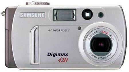 三星Digimax 420是一款于今年6月上旬发布的一款400万像素数码相机,此产品采用三星SHD3倍光学变焦镜头,镜头焦距f = 7.7 ~ 23.1mm(相当于35mm相机的38~114mm),机械电子结合型快门,4倍数码变焦,白平衡调节含自动、日光、多云、日落、荧光、钨光等模式。它使用2节镍氢电池或碱性电池,支持SD及MMC卡,该相机基本上延续了三星V4性能特点,但为了节省成本,在一些地方做了简化,比如镜头就没有延续使用施奈德镜头。现在的市价约为2700来元。
