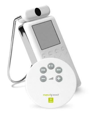 这款圆形的无线遥控器由带有5个按钮的主体和信号接收器组成,其中信号接受器可以直接插在iPod播放器上面。连接naviPod,再装备一套立体声音箱,就完全可以组成一套小型的音箱设备了。目前,该遥控器可以完成播放、停止、向前、向后和音量调节等功能。这套附加的遥控系统价格为49.88美元。