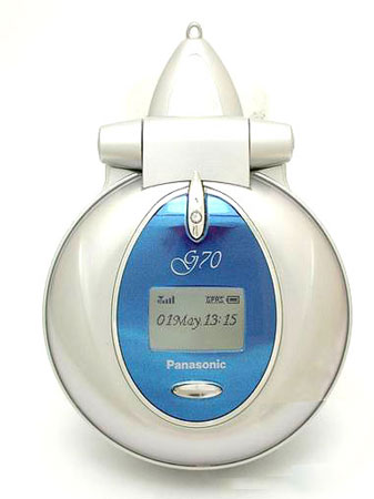 不过,当我们认真观看G70及G50,我们便会发觉,两部手机的根本分别。G70有一个独特的圆形背壳设计。机身的小尖头用来挂上手机绳。机面的小屏幕,可以显示出走针时钟,亦不损害手机的娇少感觉。在功能上看,Panasonic加入女性生态日历功能,其实不过是以图形显示每个人每天的生理及心理状态预算,亦有文字途述。G70的小方形128 x 96解像度屏幕,被镜面包围。只要按目录向上键,就可见到整个小镜子,女性用家望着小镜子化妆最适合不过。其它功能包括内置彩色图案、图片来电显示、内置游戏等。