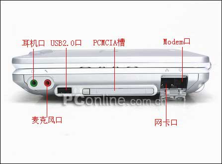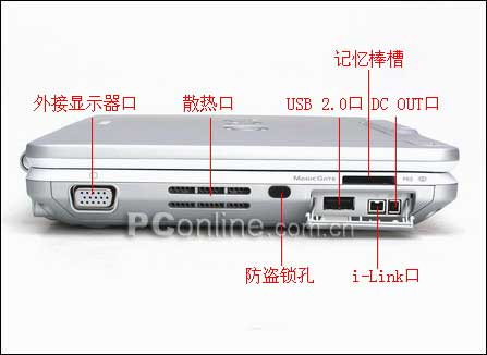 记忆棒读卡插槽 x 1、 麦克风插孔 x 1、 耳机/音响插孔 x 1、 USB 2.0 x 2、IEEE1394(FireWire) x 1、VGA输出 x 1、 电话线插槽(RJ11) x 1、 网络线插槽(RJ45) x 1、 DC OUT x 1 |