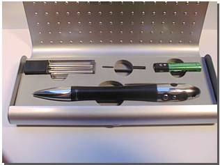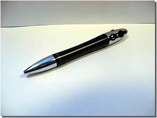 DP-353 iPEN Camera长150mm,最大直径约16mm,虽然看起来真的很像一支标准的高档圆珠笔,但其小小的体积里实际上内有乾坤,使你完全可以把它当作一部普通的DC来使用:它使用一节AM4电池,可以拍摄640x480的像素的照片,并直接保存为JPEG格式,而且自带8M内存可以储存200张照片,支持USB 1.1接口,另外还可以充当PDA或者电脑的摄像头。这款007装备包装内配件相当齐全,除了必备的USB连接线、电池、摄像头驱动程序、各种相关应用软件等附件,甚至还包括四支备用圆珠笔芯。