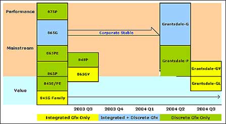 刚刚提到的Grantsdale系列跟现行的Pentium 4芯片组的对应关系,作了时间排程转换图让大家比较好了解,从图中可以发现到,未来以i865G架构来作新一代芯片的演化其实是很明显的(i865G跟i875P的差异,最大是在PAT的开启,可参考Intel网站说明),而未来的主流市场则是以Grantsdale-P来作主轴,然后再辅以Grantsdale-GV以及GL作为中低阶的选择,总合Grantsdale的特点来看,极有可能会让这款对应Prescott推出而造成市场定为重新洗牌的Grantsdale随着CPU可能提前上市而也跟着提早问世(一部分考量的原因是来自于竞争对手的压力,这要看后半年AMD的动作而决定Intel的因应之道)。