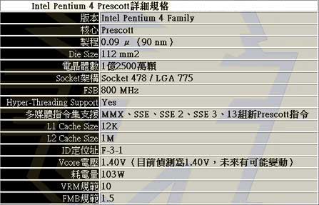 由于目前的Prescott PDF档案还没正式释放,所以根据收集来的资料加上实际测试侦测的数据整合,把这些作点整哩,Prescott采用0.09微米制程(就是90奈米)、Die Size为112 mm2、晶体管高达1亿2500万颗、FSB 800MHz、支持Hyper-Threading技术、1.4V Vcore电压(有1.35V之说,不过目前收到的Sample为1.40V)、耗电量超高103W、支援SSE 3多媒体指令集并且额外增加了13组Prescott新指令、内建12K L1以及1M L2 Cache…,算一算,Prescott真的是Intel的秘密武器,只是为了因应AMD推出Athlon 64系列的强大压力下,Prescott提前推出恐怕会是不争的事实(依照最新的消息指出,Intel将会在2003/12/3正式推出Prescott 3.2G与3.4G版本)。