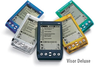 99年成立的handspring在2000年推出了自己的第一款palm产品:Visor Delux。一口气推出了五种颜色炫丽的外型,搭配略为透明的外壳,在Palm业界又掀起一片波澜-原来palm也可以这样时尚美丽。令人兴奋的是,连同步底座都是透明的雾白色。Visor Deluxe几乎成为年轻学子或新鲜人类最种意的机种。