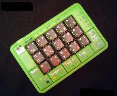 这款键盘是由一家叫做FrogPad的公司推出的单手键盘,它能够在PC上使用,这款仅仅PDA大小的键盘能够实现标准PC键盘可以实现的所有主要功能,从字母到标点再到功能键,一个都不少(当然,有些功能需要用组合键来实现)!另外,这个小小的键盘使用USB接口,也就是说它可以兼容任何PC。