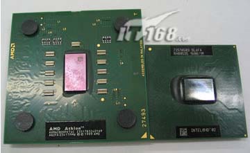 我们切入正题,先来见识一下Athlon XP的身材,它比Intel Pentium M胖多了,而且正面也没有Pentium M那样整洁,一看就能知道谁的发热量的大小。由于制造工艺和封装格式不同,也就造成了它们外观和体积的不同。