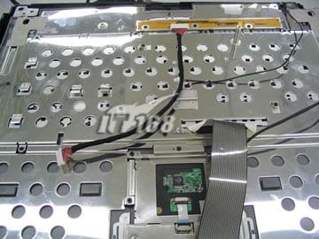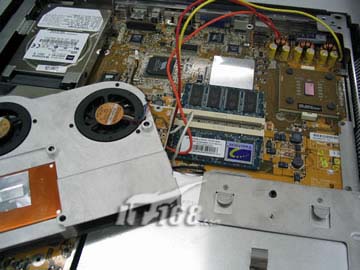 左边这不锈钢板下包的是12.7mm的光驱,右下脚下面是放电池的空间,这上面是具有双风扇的CPU散热器,在笔记本里简直可以说巨大。光驱和散热器与同类产品的比较的我们下面会谈到。这个光驱着实降低了不少成本,只是份量上也增加不少。