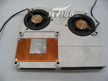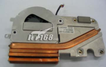 迅驰笔记本的处理器散热器,只是一个铜导管加一个风扇结合在铝制的散热架上。