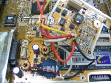 首先映入眼帘的是四根不同颜色较粗的电源线,这是你在迅驰笔记本里不可能找到的,也许是需要的电流实在太大,抑或是这种线特别便宜还比较耐热。电源线都能省,绝对的高招!
