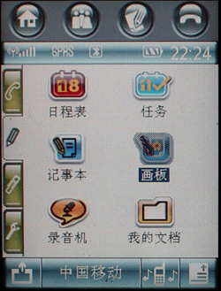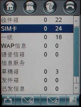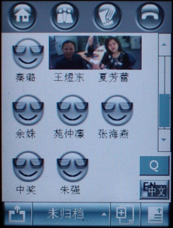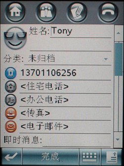 中间大部分显示是4个主要功能内的详细内容。其中联系人动态分享机身内存,容量相当惊人,采用了卡片式存储,每个联系人下面可以存储多个不同种类的电话号码和个人信息,并可将他们分类管理。其中一个比较有意思的功能就是联系人列表可以以缩略图方式显示,当你在详细信息中加入了图片之后,就可以在列表中显示出来,非常直观。当然,你也可以为每个人名定义专用的铃声,做到听声辨人。