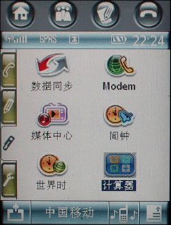 A760屏幕上显示的功能菜单分为了3大部分,最上面是主要的功能选项,分为了功能表、联系人、信息和电话四部分,其整体使用分页式设计,界面直观清爽,切换方便。
