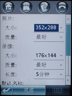 A760的摄像头为11万像素,可拍摄静态图像,在设置中可以设定352x288、320x240、160x120三种分辨率以及三级质量的照片。拍照选项中还有黑白、褐色、曝光、负片等效果和白平衡、亮度的手动调节。此外,界面上还有一个调整远近的滑动槽,进行多倍的数码变焦,但倍数过大会使图像有些模糊。