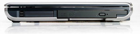 S900采用的是单手翻盖设计,轴承的松紧度恰到好处。翻开顶盖,我们也看到了好几处非传统的设计。比如说扩音器,大部分的笔记本都是设置在手腕附近,不是向上的开放式设计就是向下的开放式设计。但在S900中,扩音器竟然设置在了显示屏的下方,正对着使用者。这样设计的好处是能较好的减少空气中尘埃物的进入,同时能更好的营造环绕效果。S900的托手处采用的材料也是很特别的。在其它的笔记本中,我们多数看到的是磨沙的硬塑料或碳素。但这次我们看到的是一种镜面材料,光滑,手感也很凉快。再把S900翻转过来,看看他的底部。两条银色的镶边显示出它的个性化。S900的电池是棒状的,而且设在靠近用户的一段,估计这样的设计会使电池的发热影响到用户的舒适度。同时我们在底面能发现他的COMBO被设计为模块模式,可以随时拔出换成其它模块,例如电池、软驱等等。