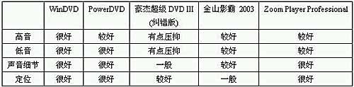 如果只追求播放效果、不考虑价格的话,WinDVD是一个不错的选择。PowerDVD的表现也不差,相信它将会是WinDVD的有力竞争者。豪杰超级DVD III的特色功能做得较多,但是在播放效果方面,它仍然有待提高。金山影霸 2003的表现不算很好,但是也不坏,要支持国产软件的话,它也是一个不错的选择。Zoom Player Professional虽然操作性很好,但是DVD播放效果并不突出,注定只能当最佳替补。