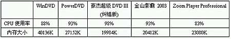 从上表我们可以看到: WinDVD占用最多内存;豪杰超级DVD III 的CPU使用率最高,但占用最少内存;相对资源占用较小的是Zoom Player Professional。