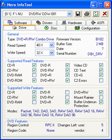 接下来我们就该实战Nero CD-DVD Speed了。首先用Nero InfoTool工具来看一下此驱动器的基本信息: