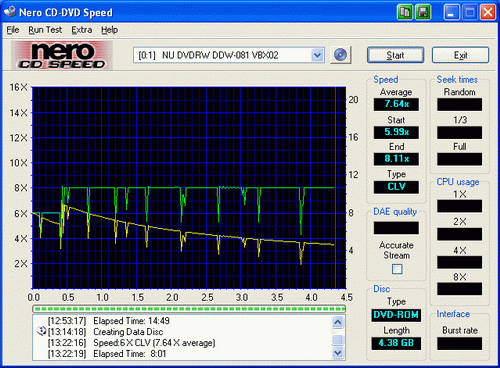 在DVD+R的模拟刻录测试中,驱动器使用CLV的工作方式。不过起始速度有些偏低,不到6速,但从10%处开始,速度攀升到了8速左右,平均速度也达到了7.64速。