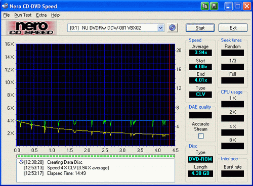 在DVD+RW的模拟刻录测试中,驱动器依然采用CLV的工作方式,并且刻录速度基本维持在一个稳定的状态。从图中我们可以看出,奇速度已达到了驱动器标称的4速。