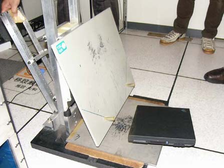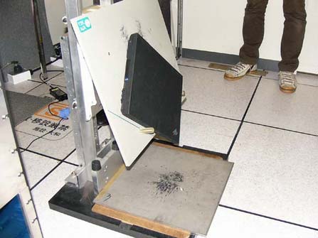 图为:ThinkPad从斜面上滑下到底座的抗撞击测试,以角落地,惨不忍睹