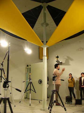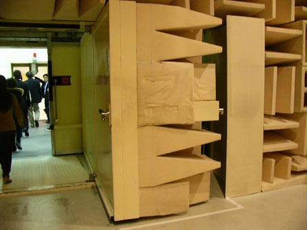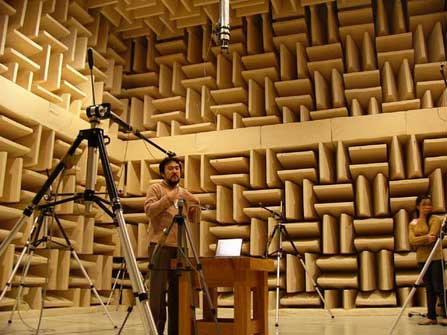 周围贴满了吸音材料的无回响测试室。由于墙壁采用了吸音材料,人入内后感到强大的压迫感。良好的测试环境令测试更加准确,这里的测试会测量以ThinkPad为中心各个方向的噪音情况。