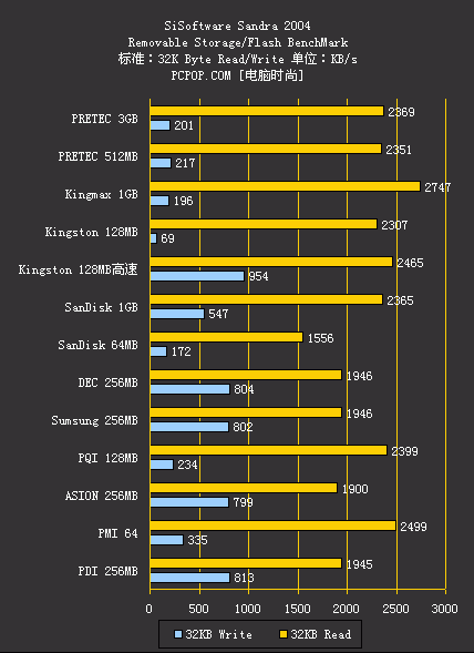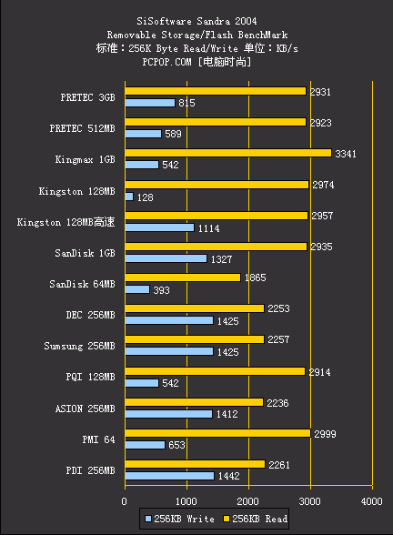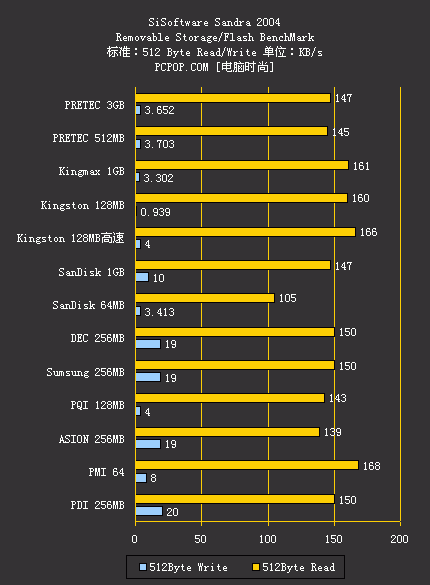 当然,这次测试中高速卡中也有非常出色的产品,例如Kingston的128MB高速卡和SanDisk的1GB高速2代,成绩就非常好,特别是写入速度的测试中比其他的产品都要高了一大截。而那些来自各名牌大厂的产品的统一特点就是读取速度非常好,而写入速度却并不理想。