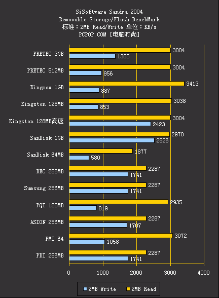 测试数据摆在我们面前,我们应该去关心什么呢?我们应该着重去看测试数据中较大文件的测试,也就是512KB以及2MB文件的读写测试,因为我们平时使用CF卡的时候,所应用的图片文件主要以这种大小为主。
