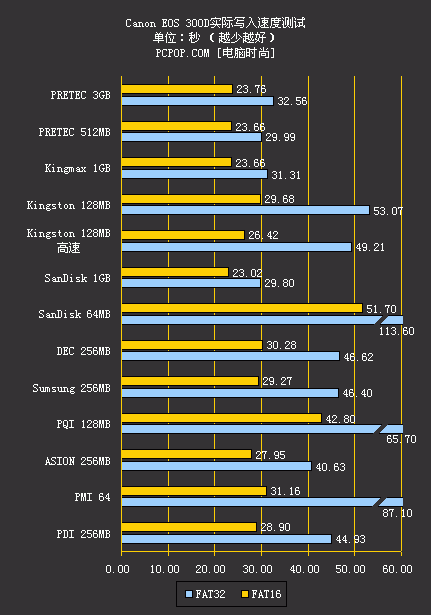 另外细心的读者一定会发现,我们将这些CF卡分成了FAT16和FAT32两种文件索引格式进行测试。而且,FAT16的成绩要高出FAT32不少,这是为什么呢……?