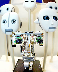 日本机器人公司Robos在东京举行的国际机器人展览上展出该公司机器人Kozoh III模型的头部。