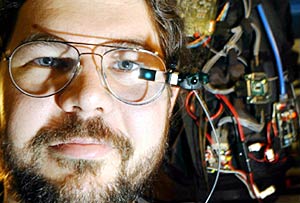 在麻省理工学院实验室,“记忆眼镜”发明人德沃戴上装载眼镜框上的小电脑显示器。 | |