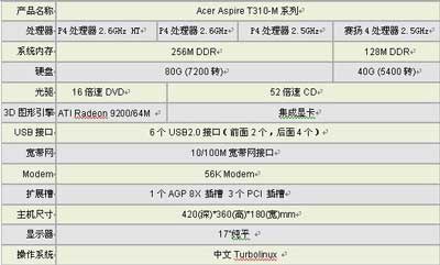 点评分析:Aspire T310 继续沿用了Aspire第三代家用机的设计??外型摩登、冷调时尚的幻银酷黑色系,其不仅外观看上去造型硬朗,而且性能强劲。据说该设计理念是宏?公司对消费者进行深入广泛调查的成果。整机看上去外观十分的冷俊简约,没有家用机那传统的花哨外观,看上去充满了科技感,配置方面也很灵活,提供了P4超线程处理器至P4处理器到最新的赛扬2.5G处理器,笔者个人比较推荐资金充足的朋友购买P42.6G的这款机型,配置上也比较强劲,而且镭9200的显卡能够支持最新的DX9以及AGP8X等标准,玩游戏的时候绝对有不同的体验,赛扬2.5G这款机型笔者不推荐购买,不知道为什么,其内存只有128M,这个容量目前已经远远不能满足日常的应用了,这样购买回来马上就面临着生机的问题,故不推荐购买。