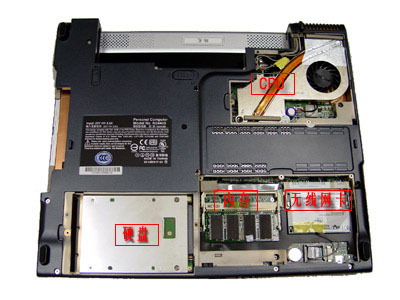 低价笔记本都有一个共同的特点,就是升级性颇好,因为这样子,代工厂商生产好一个工业模具后,品牌商可以方便的根据市场的价格随时采用更加低廉的配件。去掉了CPU、内存、硬盘盖板之后我们可以清楚的看到基本上主要的部件都是采用了模块化设计,当然这也有一个好处,就是为用户升级带来方便^_^。但是这样的设计必定使整体化减小,出现更多的不稳定机会,而且大量模块化的设计会需要更多的空间,导致机身的体积增大。