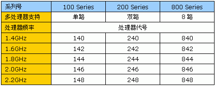 处理器方面,AMD推出Opteron系列处理器,分为100、200和800三个系列,100系列只能在单处理器条件下运行,200系列则可支持双处理器,800系列可支持8处理器。