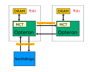这样,就造成了Opteron体系中各个处理器访问本节点内存与访问其它内存时所需时间的不一致性;同时由于所有的内存为处理器所共享,就必须保证各个处理器中相关缓存的一致性。故此,人们把具备这种特性的多处理器系统形象地称为ccNUMA(Cache Coherence Non Uniform Memory Access)。