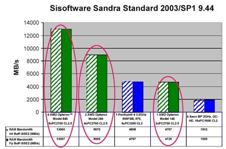 以下,就是AMD自己使用SISoftsadra2003所测试的一组单Opteron、2×以及4×Opteron的内存带宽对比数据: